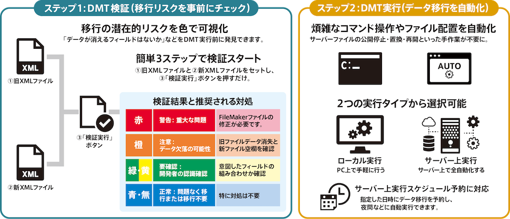Migration Master は、Claris FileMaker Data Migration Tool(以下 DMT)を補助するツールです。データ移行前に起こりうる問題を色で可視化する「DMT検証」機能と、煩雑な移行作業を自動化する「DMT実行」機能を提供します。
